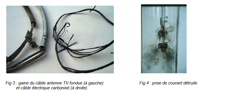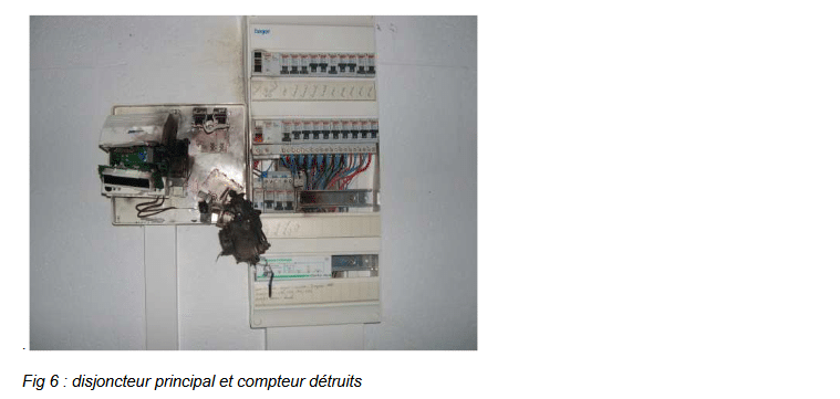 A l’intérieur de la maison, une partie du matériel électrique est également détruit. La télévision, box et autres appareils branchés à proximité de la TV ont été détruits. Le courant de foudre provenant du câble d’antenne s’est ensuite propagé aux câbles électriques pour « remonter »jusqu’au tableau électrique principal, endommageant les disjoncteurs pour finir sa course dans la prise de terre reliée au tableau électrique.