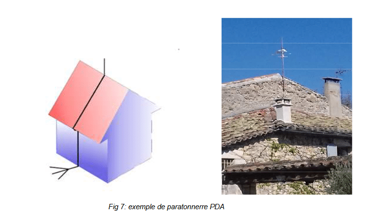 - Installation d’un dispositif de capture qui pourra être au choix un Paratonnerre à Tige simple (PTS), un Paratonnerre à dispositif d’Amorçage (PDA) ou un maillage de la toiture. A noter que la mise en œuvre d’un PDA permet de réduire la hauteur du paratonnerre à installer sur la toiture.